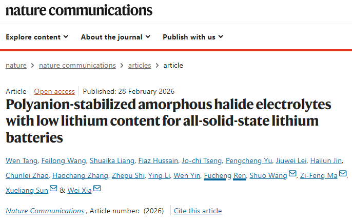 近日,由宁波东方理工大学、上海交通大学等单位组成的联合科研团队,在全固态锂电池固态电解质领域取得重要突破。团队提出阴离子簇交联化学设计策略,成功开发出聚阴离子稳定的低锂含量非晶卤化物电解质,解决了传统卤化物固态电解质高锂依赖、成本高昂、空气敏感性强的行业痛点。相关研究成果发表于国际顶级期刊《自然-通讯》(Nature Communications),为高能量密度全固态锂电池的规模化、低成本发展提供了全新材料与技术方案。